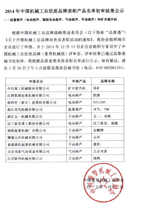 2014年中国机械工业优质品牌表彰产品名单初审结果公示